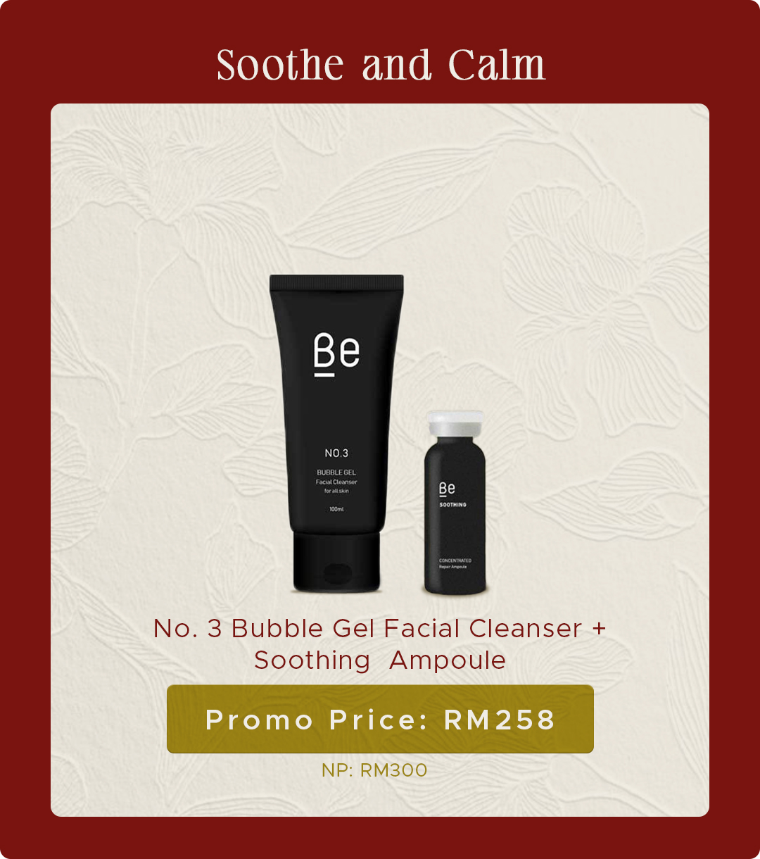 BE_ No. 3 Bubble Gel Facial Cleanser A soap-free, amino acid–based cleanser that gently removes impurities while maintaining skin’s natural moisture balance. Leaves skin clean, soft, and comfortable without dryness or residue.